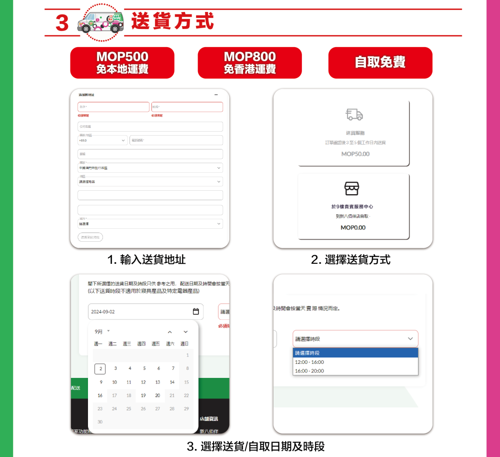 凡於新八佰伴网上商店购物满澳门币500即可免运费,消费未满指定金额将收取每单澳门币50元运费。